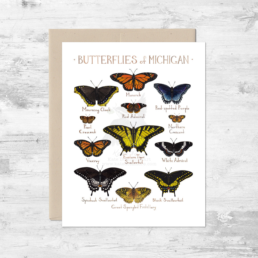 This A2 card features 12 common Butterflies of Michigan. Originally painted with watercolor, the art comes out vibrant and sharp printed on premium matte card stock.