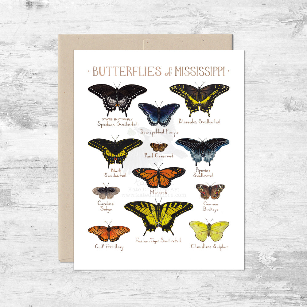 This A2 card features 12 common Butterflies of Mississippi, including the State butterfly. Originally painted with watercolor, the art comes out vibrant and sharp printed on premium matte card stock.