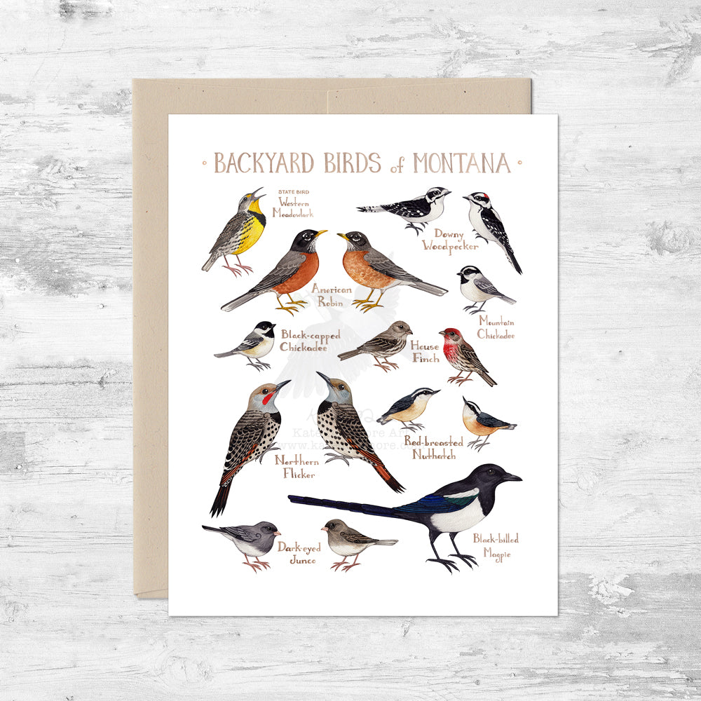This A2 card features 10 common Backyard Birds of Montana, including the State Bird. Originally painted with watercolor, the art comes out vibrant and sharp printed on premium matte card stock.