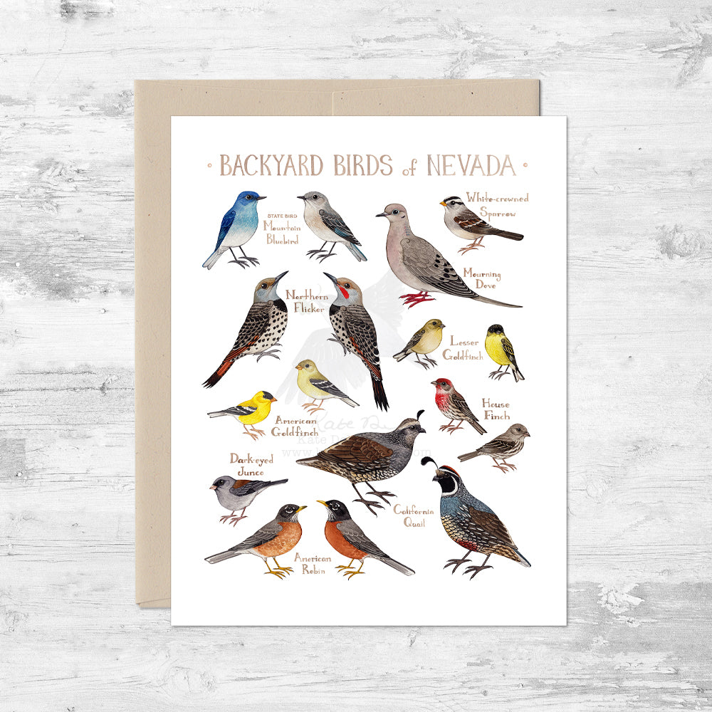 This A2 card features 10 common Backyard Birds of Nevada, including the State Bird. Originally painted with watercolor, the art comes out vibrant and sharp printed on premium matte card stock.