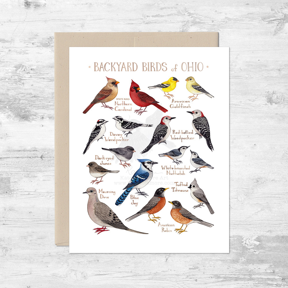 This A2 card features 10 common Backyard Birds of Ohio, including the State Bird. Originally painted with watercolor, the art comes out vibrant and sharp printed on premium matte card stock.