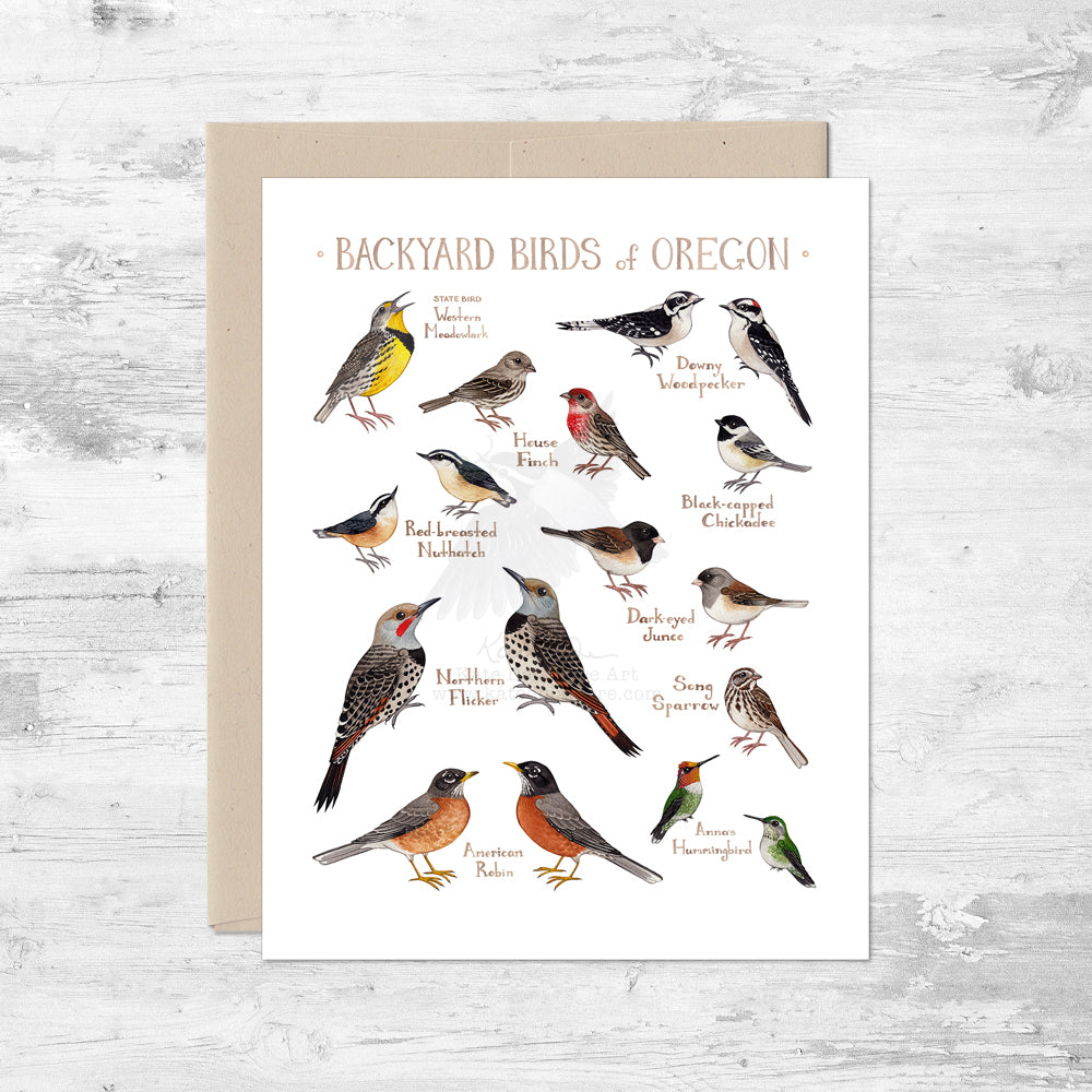 This A2 card features 10 common Backyard Birds of Oregon, including the State Bird. Originally painted with watercolor, the art comes out vibrant and sharp printed on premium matte card stock.