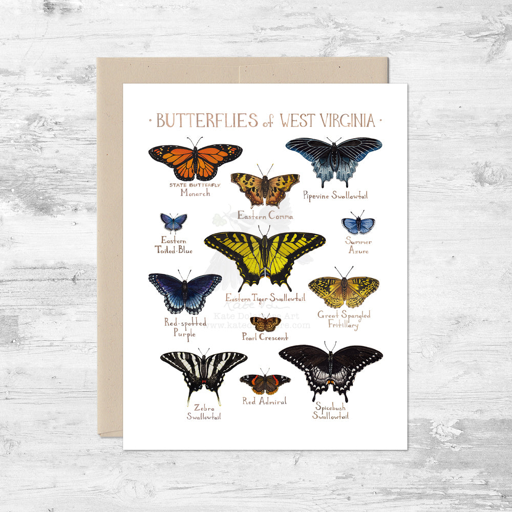This A2 card features 12 common Butterflies of West Virginia, including the State butterfly. Originally painted with watercolor, the art comes out vibrant and sharp printed on premium matte card stock.