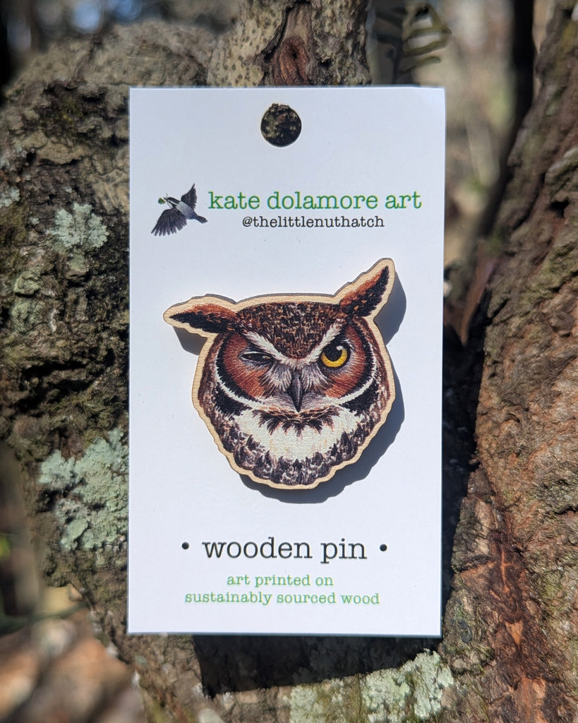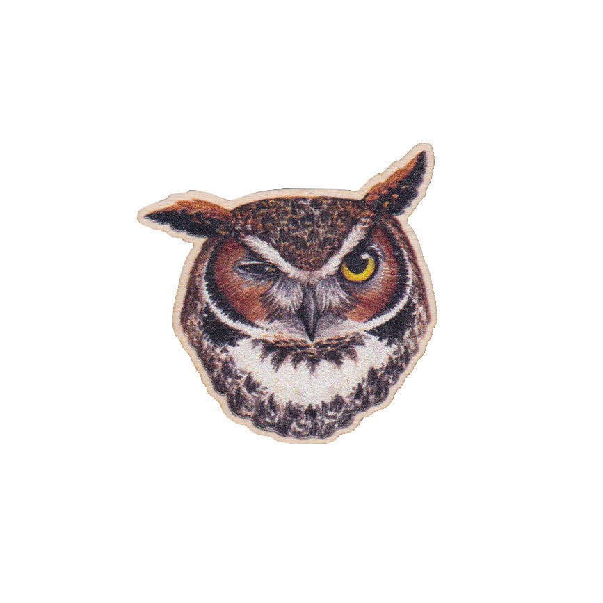 This wooden pin features a Great Horned Owl.